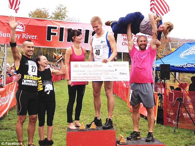 The 15th annual North American Wife Carrying Championship is scheduled for 11am on Saturday, October 11, 2014 during Sunday River's Fall Festival weekend. Wife-carrying is based on husband-and-wife teams racing with the husband carrying the wife through a regulation length 278-yard obstacle course featuring log hurdles, sand traps, and the always popular "widow maker" water hazard. The fastest two teams from the qualifying round then compete head-to-head in a final heat. Competing couples do not have to be married, though they must be comprised of a man and a woman and both must be at least 21 years old to enter. How the wife is carried is the competitors' choice, though most Wife Carrying Winners 2013use the "Estonian carry" where the female participant holds the male around the waist and tightens her legs around his neck, thereby freeing his hands.