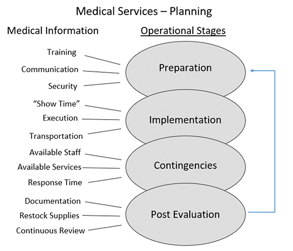 The planning and preparation of medical support in the post-COVID reality should prioritize strategies to protect attendees, performers/participants, broadcasters, facility staff and support personnel. Everyone involved with protecting the health and wellbeing of others in conjunction with events must remember and consider all possible scenarios and contingencies to keep patrons safe and to save lives if an unforeseen tragedy should occur. The figure below “Medical Services Planning,” illustrates the relationship between medical-related information and the four stages of operations which include preparation, implementation, contingencies, and post-evaluation.