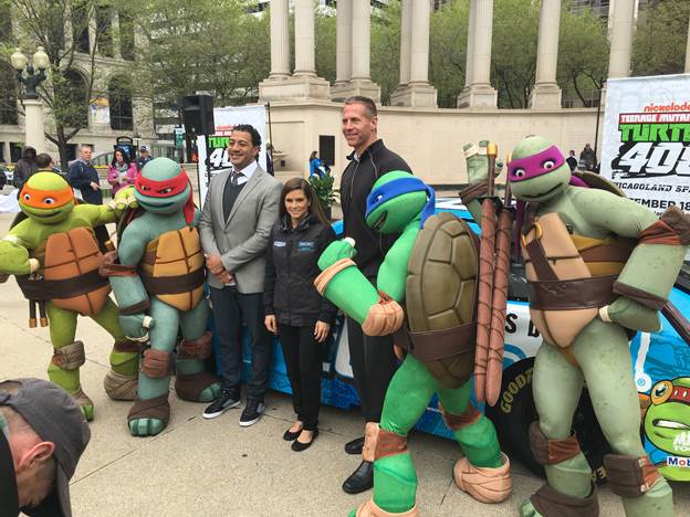 NASCAR star Danica Patrick, a Roscoe, Illinois native, helped kick off the partnership in true Turtles style. She unveiled her No. 10 April O’Neil/Nature’s Bakery Chevrolet SS at an event at Wrigley Square in Millennium Park with the Teenage Mutant Ninja Turtles, then took her car for a spin down Michigan Ave. She will join a number of other drivers with Teenage Mutant Ninja Turtles paint schemes for the Sept. 18 race.
