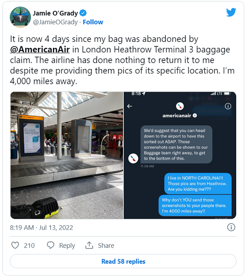 In one scenario, a US flyer tracked his lost luggage back to London and was told by American to go pick it up from the airport — even though he was 4,000 miles away in North Carolina. (Don’t miss his tweet; it went viral).
