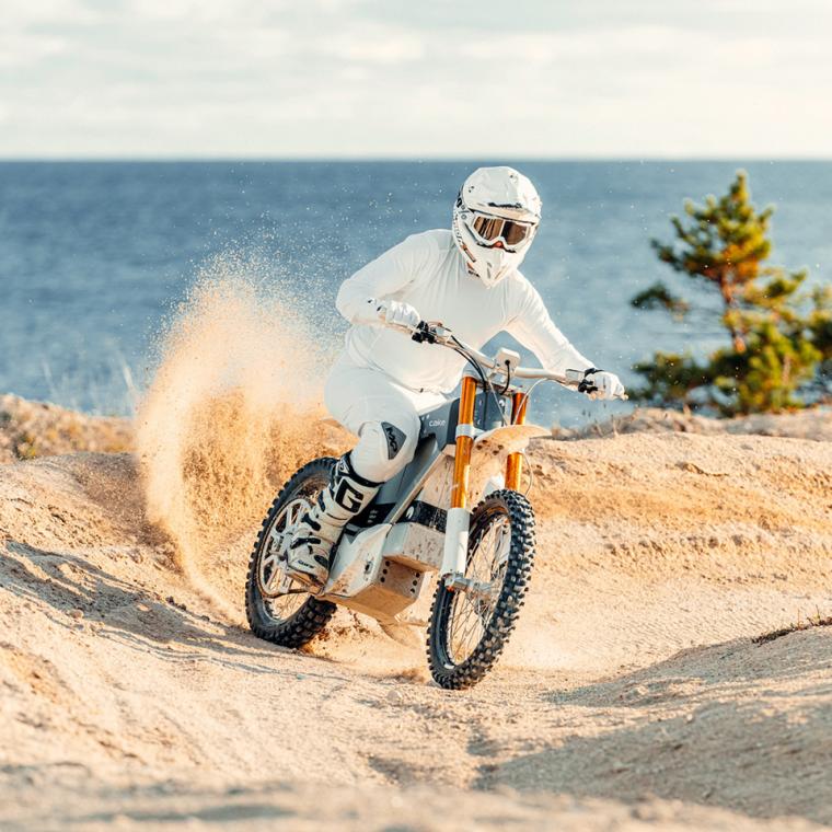 The powerful drivetrain on the featherweight Kalk OR Race delivers 280Nm of torque at the rear wheel, so it can get up to full speed faster than most of its gas-powered counterparts. CAKE founder Stefan Ytterborn believes that’s a game changer for the future of sustainable motocross racing. Less room needed to accelerate means tracks can be built in smaller areas, leading to a more spectator-friendly venue. And because electric motorcycles are virtually silent, polluting with neither sound nor emissions, tracks and racing can be brought into suburban environments, making the sport more accessible to fans and participants alike.