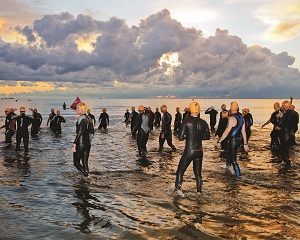 Swimmers start the first leg of their competition in Lake Erie during the annual Cedar Point Challenge Triathlon and Vermilion’s Linwood Park Triathlon.