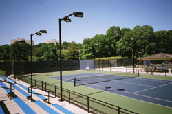 Something players will appreciate is a lounge area, or a furnished place to relax between matches, or until their court becomes available. Benches, shade shelters, tables and so forth are examples of these kinds of furnishings. A nearby patio will encourage larger groups to gather to watch play. A drinking fountain, concession stand or soda machine can add to the comfort level. Players will also appreciate lockers or other storage facilities, since most competitive players tend to travel with changes of clothing, multiple racquets and so on. If rest rooms and showers are not located nearby, changing booths can be created for players using special drapes that fit around umpire chairs.