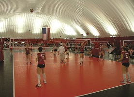 With 90,000 column-free square feet of playing space and a 70-foot-high ceiling, the Woodside Wisconsin Dells Center Dome can accommodate 16 modular volleyball courts (or 10 basketball courts, up to 32 wrestling mats or a full synthetic turf soccer, softball, lacrosse or football field). While it can host a 100-team youth tournament on any given weekend, it also began hosting men’s tourneys in 2014, Jones says.